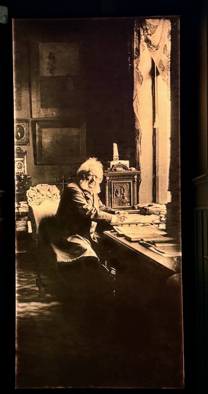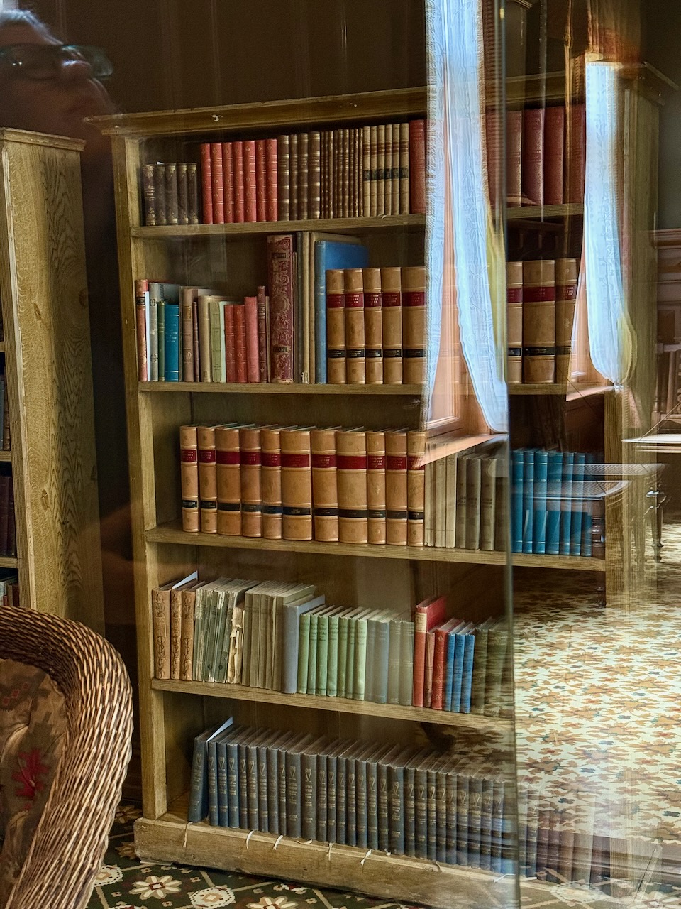 The other rooms, where the Ibsens lived, were much plainer. Here are Suzannah’s bedroom and its neighbor, the library. (Many of the rooms are protected by transparent panels, which cause unavoidable reflections in photos. I encourage you to see the museum’s website, where you’ll find better photos and more information about the restoration of the apartment and museum.)